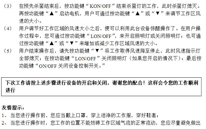 設(shè)備開始進入工作狀態(tài)。此時風(fēng)速轉(zhuǎn)速指示燈亮起兩格(此為初次開機或拔插電源后的初次預(yù)設(shè)的工作區(qū)風(fēng)速,為初次默認值),此時送風(fēng)電機已經(jīng)按照預(yù)置設(shè)定開始工作,用戶此時按功能鍵“▼”來減少工作區(qū)得風(fēng)速直**風(fēng)速指示燈全部熄滅;